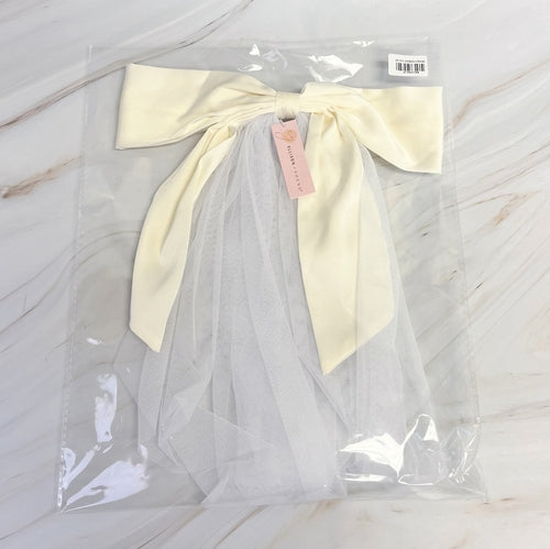 Get ready to turn heads with the OMG Beauty Veil Bow Hair Clip. With a statement satin bow and a delicate tulle veil drop, this clip is perfect for weddings and photos. Its beautiful design will add a touch of elegance to any hairstyle, making you feel confident and glamorous. Step up your hair game with this must-have accessory.